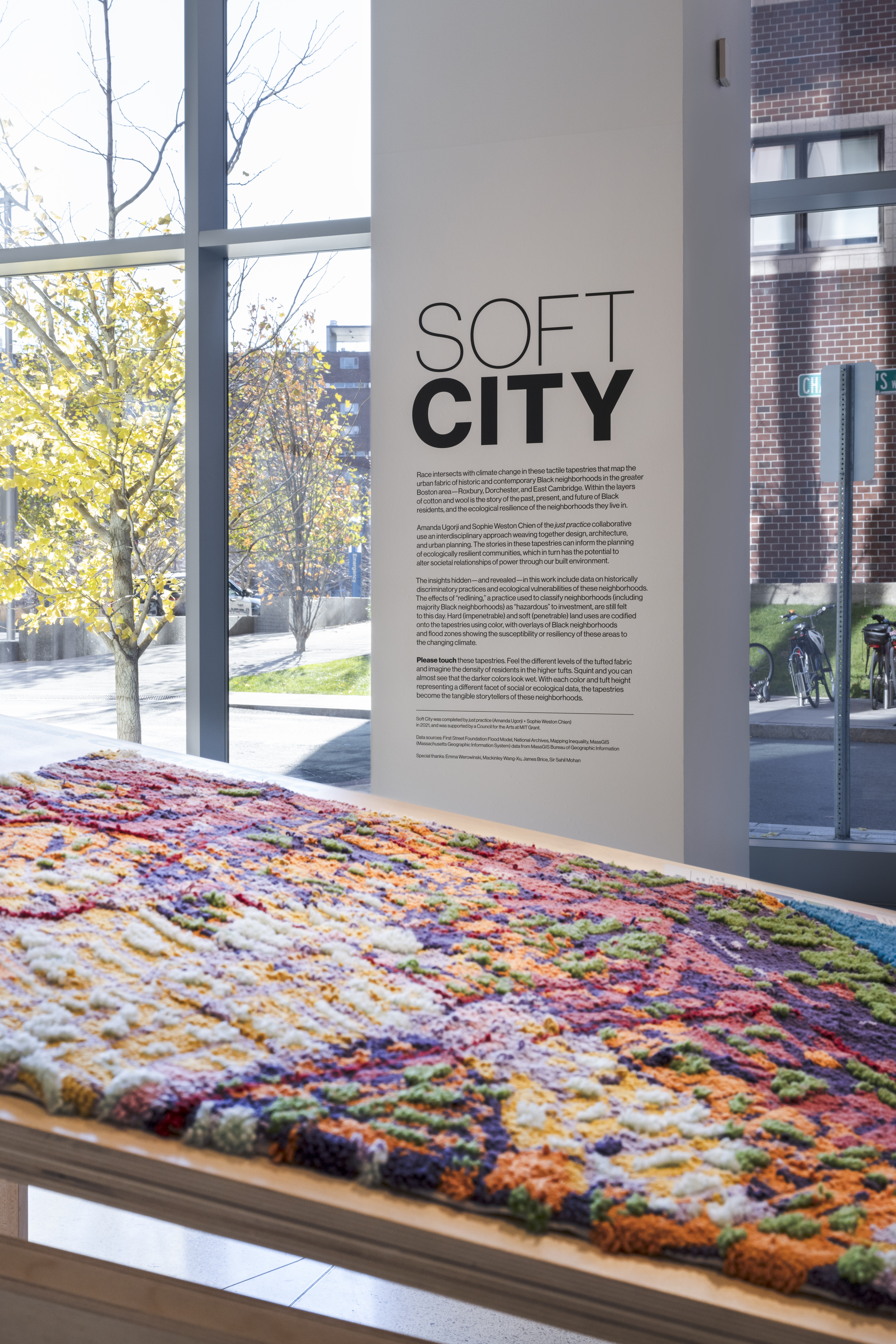 Soft City is a large-scale textile series that maps the urban fabric of Black neighborhoods in the Boston area. The tapestries map historic (redlined) and contemporary Black neighborhoods, including Roxbury, Dorchester, and East Cambridge. The information mapped tells the story of the past, present and future of Black residents, and the ecological resilience of the neighborhoods they live in. Hard (impervious) and soft (pervious) land uses are codified using colors with overlays of Black residents and flood zones on the tapestries. The softness and materiality of tufting interrogates the traditional top-down approach to space planning and management in the city and offers new tactile ways to explore our understanding of urban space, at all ages.